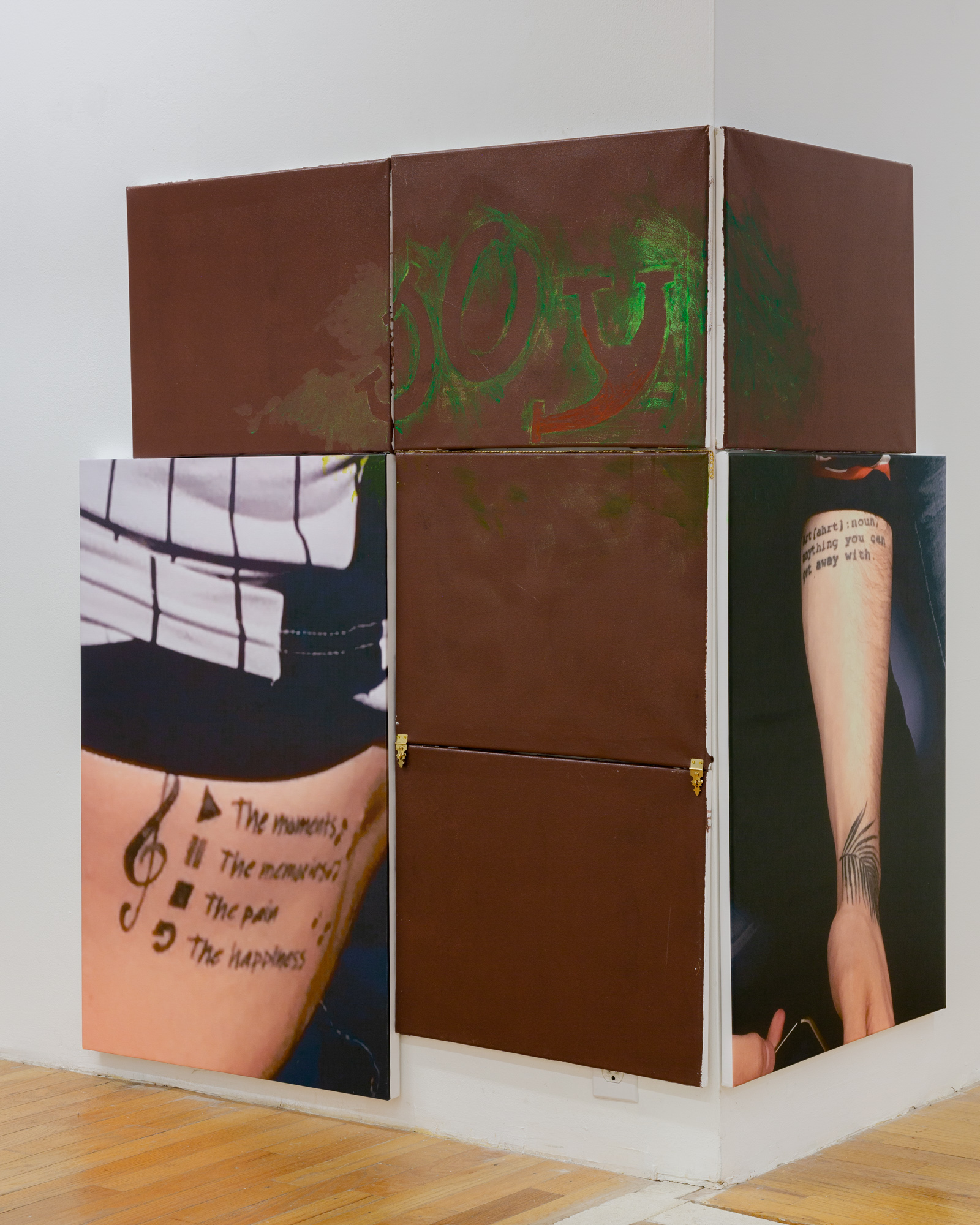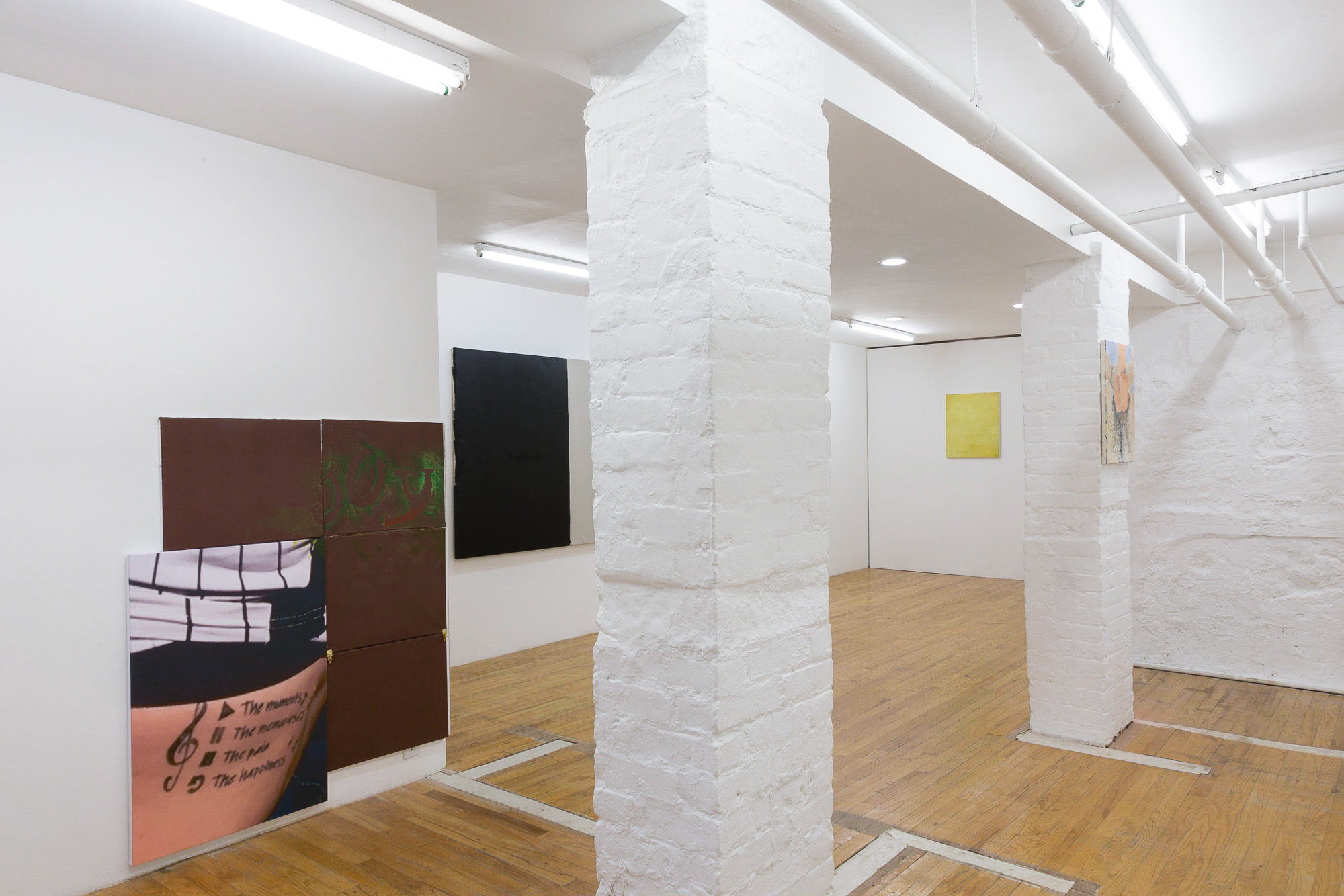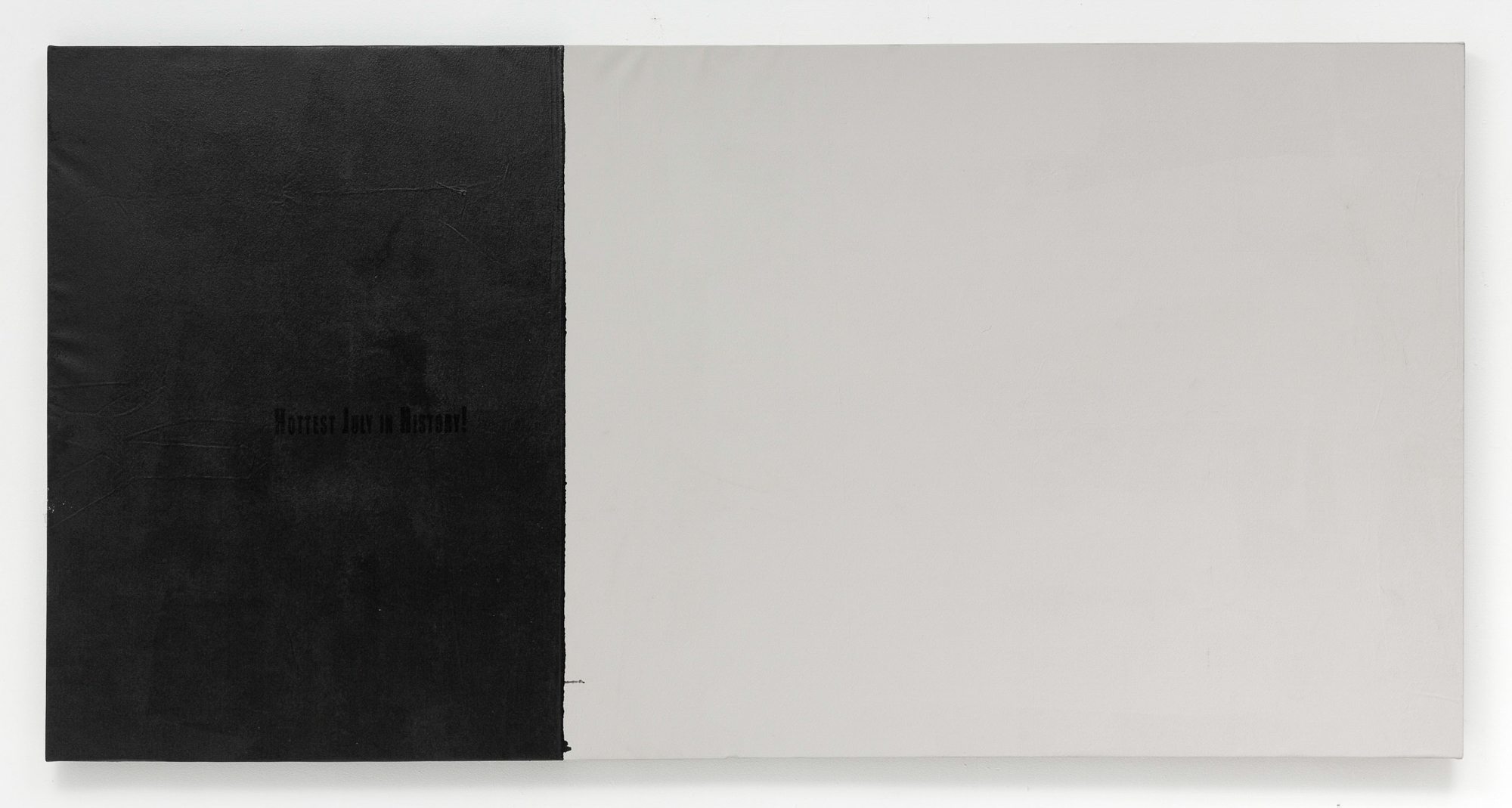 Thank you, Rory, similarly, for presenting ghostly artifacts that have “survived” post-climate crisis: compromised/found color palettes, banal texts of tattoos, empty containers. Thanks for the acceptance and uncynical embrace of the bright emptiness. It means a lot. Thanks for the overly lit bankruptcy of your found language: the featured word “Joy” in your dark, multi-paneled painting. It’s a “joy” that has not abandoned its “state of happiness” definition, as much as inflated it from a standpoint of extinction. It’s a “joy” that echoes the found text of the tattoo language in that same painting: “the memories, the pain, the happiness.” The “joy” of Evie’s objects is a useful parallel to the “joy” of your found text, and we thank you both for that. And thank you again, Rory, for making this even more evident in another work where the text is central: “Hottest July In History.” Thanks for the powerful yet subtle collision of the found text, in this new context of extinction. The hardly discernible black text on a black background speaks to the same studied, ghostly “joy” intersecting the present and the post-climate extinction of the other side.